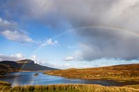 Landschapsfotografie op het Isle of Skye in Schotland. Een regenboog schijnt over het loch en het herkenningspunt van het eiland, de Old Man of Storr,