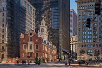 The Old State House te Boston, gebouwd in 1713. Een bijzonder contrast tussen alle moderne hoogbouw in de stad.