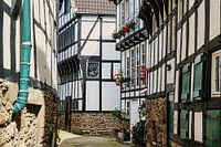 Oude stadsstraat met gevels van vakwerkhuizen in Hattingen Ruhrgebied Duitsland