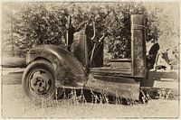 Oud wrak dat lang geleden werd gebruikt in een kamp van houthakkers in de bergen van Californië.
