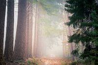 Oude reuzen staan tegenover jonge stammetjes in een mistig bos op de Utrechtse Heuvelrug