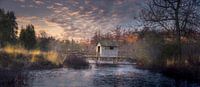 Midden in deze serene omgeving staat een verweerd houten huisje op palen, verbonden met de oever door een smalle, krakende brug. Het lijkt een plek uit een vergeten tijd, een schuilplaats voor hen die de stilte zoeken. De eerste zonnestralen werpen een warme gloed over het landschap, waarbij het goudgele gras en de nevelige lucht in zachte tinten oplichten.