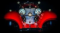 Foto van de voorkant van een klassieke Mercedes-Benz oldtimer met grille en koplampen, verlicht in rood tegen een zwarte achtergrond