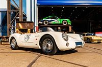 Witte oldtimer Porsche in beeldnet op de achtergrond twee andere porsches uit latere tijden.