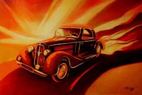 Het origineel van deze kunstdruk in retrostijl is een olieverfschilderij, 100% handgeschilderd en met de hand gesigneerd! De kleuren oranje, rood, geel en de bruine tinten zijn bedoeld om een warme sfeer te creëren.