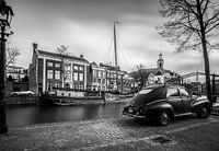Zwartwit opname van een geparkeerde oldtimer aan de lange haven in Schiedam