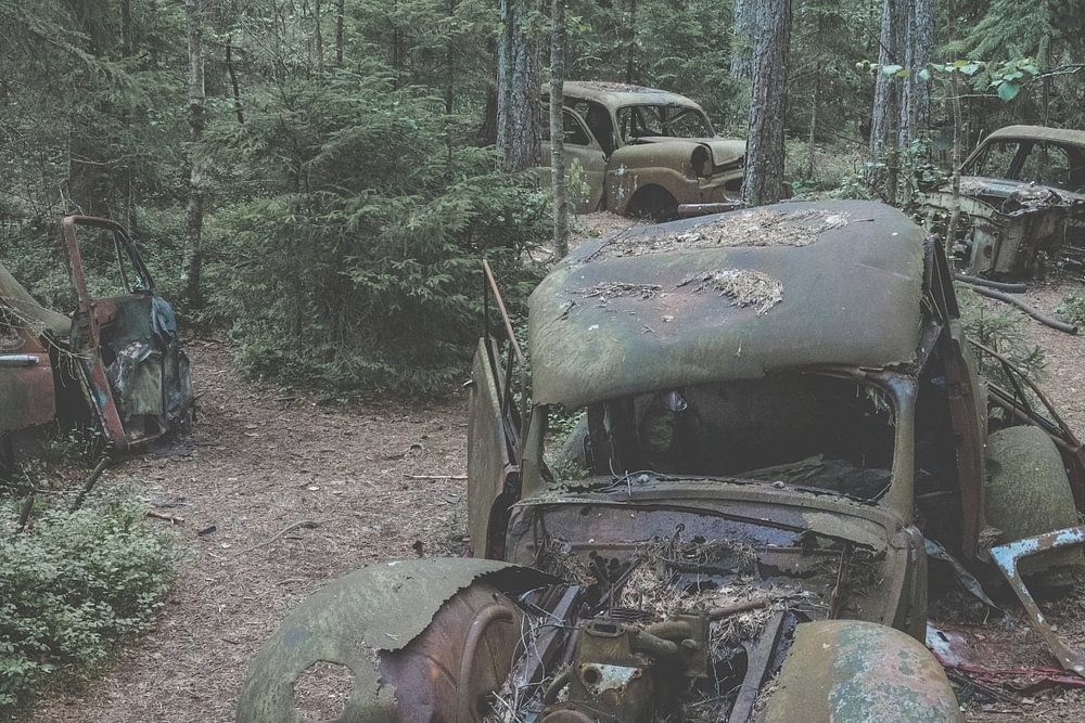 Een achtergelaten auto in de wilde bossen van Zweden, Scandinavië. In dat bos lagen verschillende wrakken. Een groot autokerkhof midden in de natuur.