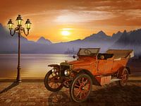 Romantische zonsondergang over het meer, met vintage auto en nostalgische straatlantaarn.