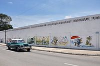 Klassieke auto in de cubaanse straten met straatkunst op de muren