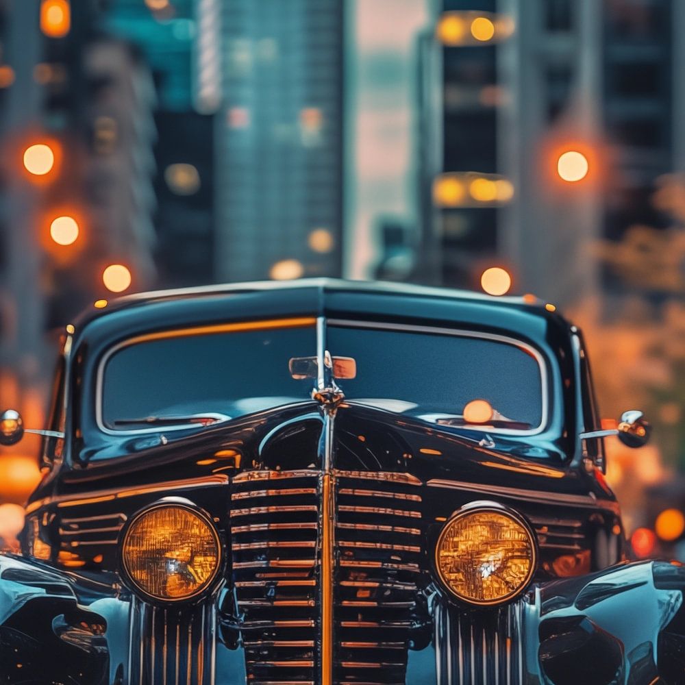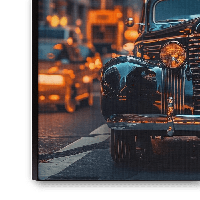 Oldtimer in een drukke stad schilderij met een prachtige en unieke stijl. Met prachtige kleurtinten en een uniek ontwerp maakt dit tot een stijlvolle fotoprint die prachtig staat in elke ruimte. 100% uniek en origineel!