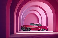 Prachtig beeld van een klassieke auto in een gewelfde colonnade. In 1 roze rood tinten. Geïnspireerd op de auto's uit de jaren 50 in een Cubaans decor. Een heel decoratief stuk voor in de woonkamer of voor op kantoor.