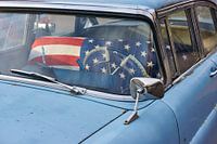 Closeup van een lichtblauwe oldtimer retro auto met amerikaanse vlag over de bestuurders bank.