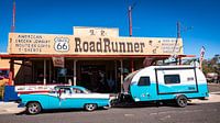 Oldtimer met caravan voor Restaurant Shop Roadrunner in Arizona USA