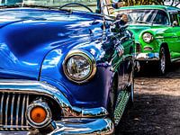 Knipsels van oldtimers in blauw en groen in Havana Cuba