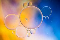 Druppels olie drijven op water waar een gekleurde ondergrond onder ligt. Vooral als afdruk op metaal prachtig aan de wand.