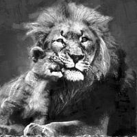 Een zwart wit olieverf portret van een leeuw met zijn welp.