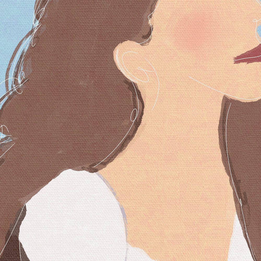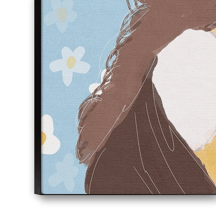 Een canvas van een eenvoudig olieverfschilderij van een meisje met krullend haar in de zomer, met een gebloemde babyblauwe achtergrond en kleine witte lijntjes.