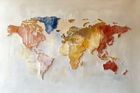 Olieverfschilderij van een wereldkaart met een abstracte en textuurrijke weergave van de continenten. De kleuren die gebruikt werden zijn verschillende tinten rood, geel, blauw, en beige.