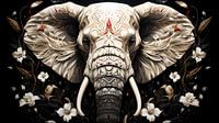 De rijke versieringen op de huid van de olifant zijn samengesteld uit fijne, gedetailleerde patronen die erg lijken op de mandala-kunst, en geven het beeld een bijna sacrale allure. De rustgevende achtergrond is gehuld in een diepe, ondoordringbare zwartheid die de lichte, crèmekleurige tinten van de olifant en de omringende flora laat oplichten. Tussen de sierlijke lijnen en krullen ontluiken delicate witte bloemen, die in harmonie lijken te zijn met de majestueuze olifant. Rode en gouden accenten geven een subtiele vibratie van leven en energie.