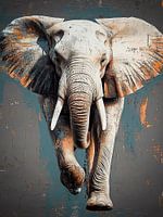 Olifant Schilderij | Ivory Sentinel - Dit dieren schilderij toont een majestueuze olifant met prominente slagtanden en imposante oren, versterkt door een opvallende achtergrond met oranje en grijze tinten.