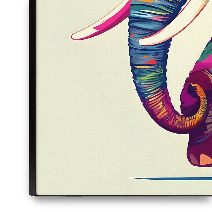 Dompel jezelf onder in de wereld van levendige kleuren en expressieve kunst met dit adembenemende schilderij van een olifant. Elk detail, van de verweven patronen tot de speelse verfspatten, straalt creativiteit en passie uit.