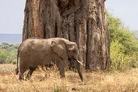 Deze Afrikaanse olifant wandelt rustig langs een Baobab boom in Tarangire Nationaal park in Tanzania in het Oosten van Afrika. Afrikaanse olifanten zijn de grootste landdieren in de wereld en kunnen wel 5 meter lang en 3,5 meter hoog worden. Zo wandelend voor de Baobab boom is ook duidelijk te zien wat de gigantische omvang van deze boom is. Een indrukwekkend beeld en kenmerkend voor het Tarangire Nationaal Park waar de Baobab boom, ook wel apenbroodboom genoemd, vooral voorkomt.