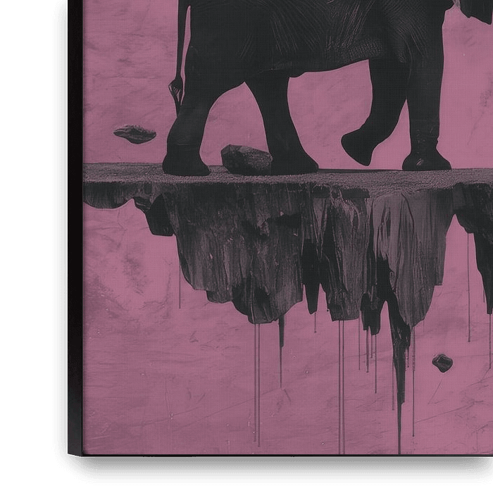 "Olifant bij Maanschijn" is een fascinerend kunstwerk dat de majestueuze gestalte van een olifant vastlegt tegen een surrealistische, paarse achtergrond met een gigantische maan. De olifant lijkt op een smalle, zwevende brug te lopen, wat een gevoel van mysterie en avontuur oproept. De gedetailleerde textuur van de olifant contrasteert…