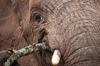 Oog, slurf slagtand alles in detail, terwijl de bast van een tak wordt gegeten.