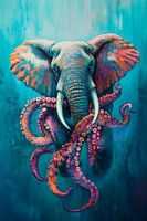 Een olifant troont met majestueuze gratie in een koel, aquatisch kleurenspel. Zijn oren ontvouwen zich als kleurrijke vleugels, terwijl een levendige octopus zijn krachtige tentakels rond zijn slurf slingert. Deze symbiose van land en zee straalt een magische energie uit die het hart van elke fantasie sneller doet kloppen.