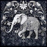 Dierenportret van de majestueuze olifant uitgevoerd in zwart- wit en grijstinten. Het dier bevindt zich in een weelderig landschap en is omringd door bloemen en planten. De dierenprint heeft een vierkant afdruk formaat. Het schilderij geeft de olifant en de plantenwereld van het oerwoud niet realistisch weer maar in een vereenvoudigde vorm.