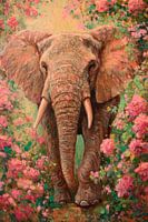 Met een majestueuze aanwezigheid baant een vriendelijke reus zich een weg door een zee van bloeiende rozen. De krachtige maar zachte oren en imposante slagtanden schitteren te midden van levendige kleuren. De foto geeft een harmonieuze ontmoeting weer tussen de kracht van de natuur en de delicate schoonheid van de flora eromheen.