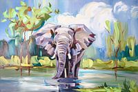 Dit schilderij toont een prachtige olifant in zijn natuurlijke omgeving, omringd door heldere, abstracte vormen en levendige kleuren. De zachte penseelstreken en het gebruik van diverse tinten geven de scène een dynamische, expressieve uitstraling. De olifant staat deels in het water, wat een gevoel van rust en sereniteit toevoegt aan het beeld. De frisse kleuren van het groen en blauw weerspiegelen een natuurlijke sfeer en geven het schilderij een kalmerende uitstraling, perfect voor een modern interieur. Deze unieke weergave van de olifant maakt het werk ideaal voor elke ruimte die behoefte heeft aan een levendige en natuurlijke touch.