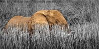 Afrikaanse Olifant foeragerend in een moeras in Botswana. De Olifant is half verscholen in het riet. De foto werd gedeeltelijk omgewerkt naar zwart wit, waarbij de planten zwart wit zijn en de Olifant de natuurlijke kleuren heeft