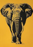 Monochrome retro riso print van een olifant, die zijn kracht en wijsheid uitstraalt, tegen een gele achtergrond. Deze poster combineert vintage charme met de majestueuze aanwezigheid van een olifant, perfect voor een unieke en opvallende wanddecoratie.