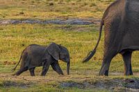 Het jong van een Afrikaanse olifant (Loxodonta africana) volgt zijn moeder aan de rand van de Chobe rivier in Botswana.