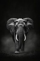 Majestueus en krachtig breekt de olifant door de duisternis, waarbij zijn imposante oren en indrukwekkende slagtanden in het oog springen. De monochrome afbeelding creëert een tijdloze elegantie die perfect past in een woonkamer en een vleugje wildheid en kracht toevoegt aan elke kamer. Een blikvanger die uitnodigt tot verwondering.