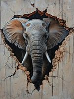 Olifant - Dit olifantenschilderij toont een realistische afbeelding van een olifant die door een gebarsten muur lijkt te breken, met een sterke nadruk op gedetailleerde texturen en een levendige expressie.