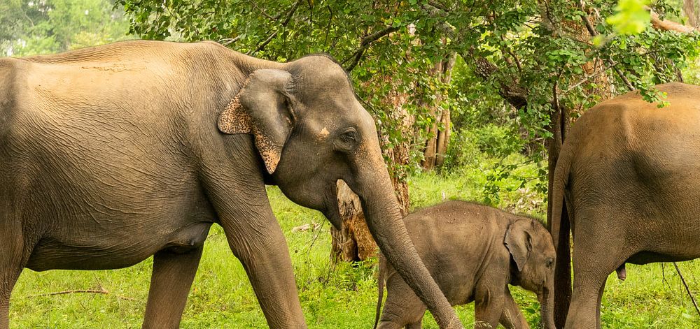 In de jungle van Sri Lanka, prachtige olifanten op een rij. Met ook baby olifantjes.