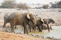 Heerlijk met de hele familie olifant in de waterpoel in Etosha spetteren en slurpen. Heerlijk genieten op zo'n hete dag.