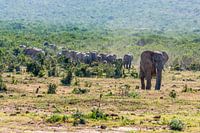 Deze kudde olifanten komt aangestormd op zoek naar water. Foto is genomen in Addo Elephant National Park in Zuid-Afrika.