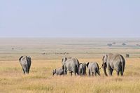 Olifanten kudde in Kenia die gezamenlijk wegtrekken.