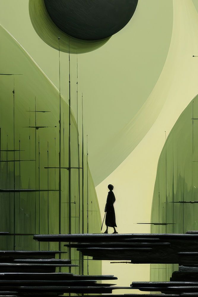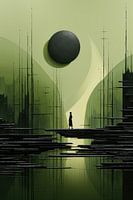 Dit schilderij verkent de grenzen van moderniteit met zijn olijf groene horizonnen die de verbeelding prikkelen. De strakke lijnen en geometrische vormen suggereren een stedelijk landschap, terwijl de diepe groene kleur een gevoel van rust en sereniteit brengt. Het spel van licht en schaduw geeft een dynamisch effect, waardoor het kunstwerk tot leven komt en een eigentijdse sfeer creëert.