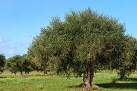 Verschillende olijfbomen staan voor een blauwe hemel op een weiland in Zuid-Europa
