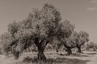 Een foto van oude olijfbomen omgezet in een sepia vintage sfeer om de oudheid van de bomen nog eens extra te benadrukken. Foto is gemaakt in Zuid Frankrijk in de Minervois.