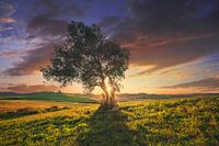 Olijfboom bij zonsondergang. Maremma landschap, glooiende heuvels en groene velden in het voorjaar. Bibbona, regio Toscane, Italië