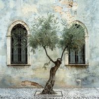 Deze sfeervolle foto toont een majestueuze olijfboom voor een oude, verweerde gevel. De architecturale details van het raam, gecombineerd met de natuurlijke charme van de boom, creëren een harmonieus evenwicht tussen de natuur en de bebouwde omgeving. Dit kunstwerk is perfect voor liefhebbers van mediterrane landschappen en klassieke architectuur en brengt een tijdloze en rustige sfeer in elke kamer.