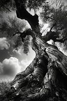 Deze indrukwekkende zwart-witfoto van een eeuwenoude olijfboom straalt kracht en eeuwigheid uit. De gedetailleerde structuur van de knoestige bast en de majestueuze, vertakkende takken reiken krachtig naar de hemel. De contrasterende tinten en het dramatische perspectief geven dit kunstwerk een diepe, emotionele impact, ideaal voor liefhebbers van natuur- en zwart-witfotografie. Perfect voor woonkamers of werkruimtes die een statement willen maken.