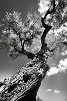 Deze indrukwekkende zwart-witfoto van een eeuwenoude olijfboom straalt kracht en eeuwigheid uit. De gedetailleerde structuur van de knoestige bast en de majestueuze, vertakkende takken reiken krachtig naar de hemel. De contrasterende tinten en het dramatische perspectief geven dit kunstwerk een diepe, emotionele impact, ideaal voor…