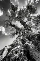 Deze indrukwekkende zwart-witfoto van een eeuwenoude olijfboom straalt kracht en eeuwigheid uit. De gedetailleerde structuur van de knoestige bast en de majestueuze, vertakkende takken reiken krachtig naar de hemel. De contrasterende tinten en het dramatische perspectief geven dit kunstwerk een diepe, emotionele impact, ideaal voor liefhebbers van natuur- en zwart-witfotografie. Perfect voor woonkamers of werkruimtes die een statement willen maken.