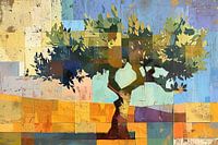 Olijfboom - Op dit schilderij zie je een abstracte olijfboom met kleurrijke geometrische vormen op de achtergrond, wat een vrolijke uitstraling geeft aan het tuin schilderij.